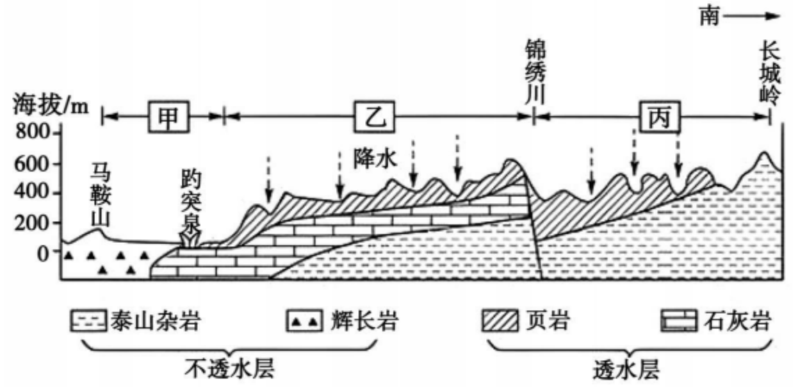 ②地势高处的不透水层,需丙区域地下水位较高才能回补泉区