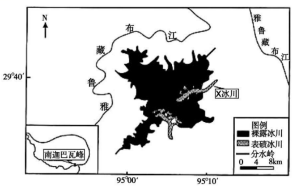 南迦巴瓦峰是喜马拉雅山东段最高峰,山脉南北坡气候差异显著。南坡沟谷众多且沟谷内冰川发育典型(如图),雪线较北坡高。该区以裸露冰川(冰川表面冰碛物少)和表碛冰川(冰川表面多冰碛物)为主,表碛冰川表层冰碛物总体厚度大(表碛厚度较小时能够加速冰面消融),且自上而下厚度变化明显。其中X冰川为该区山谷表碛冰川的典型代表,冰川内部多混杂着众多的冰碛物。1980-2015年,随着全球气候的变暖,该区冰川数量发生了明显的变化(如图)。回答6-8题。