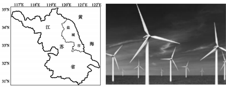 为积极应对气候变化,以“绿色转型赋能未来”为主题的中国新能源高峰论坛在江苏盐城召开。盐城是我国海上风电发展最活跃的区域之一,目前已建成海上风电总装机容量居全国首位,成为名副其实的“海上风电第一城”和绿色能源城市。下图为江苏盐城市位置图及海上风电场景观图。