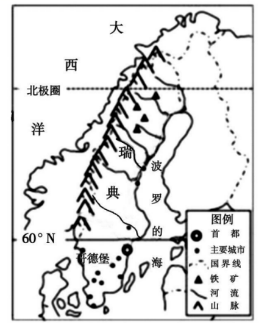(2)分析瑞典适宜人口生活居住地区较小的原因。(6分)