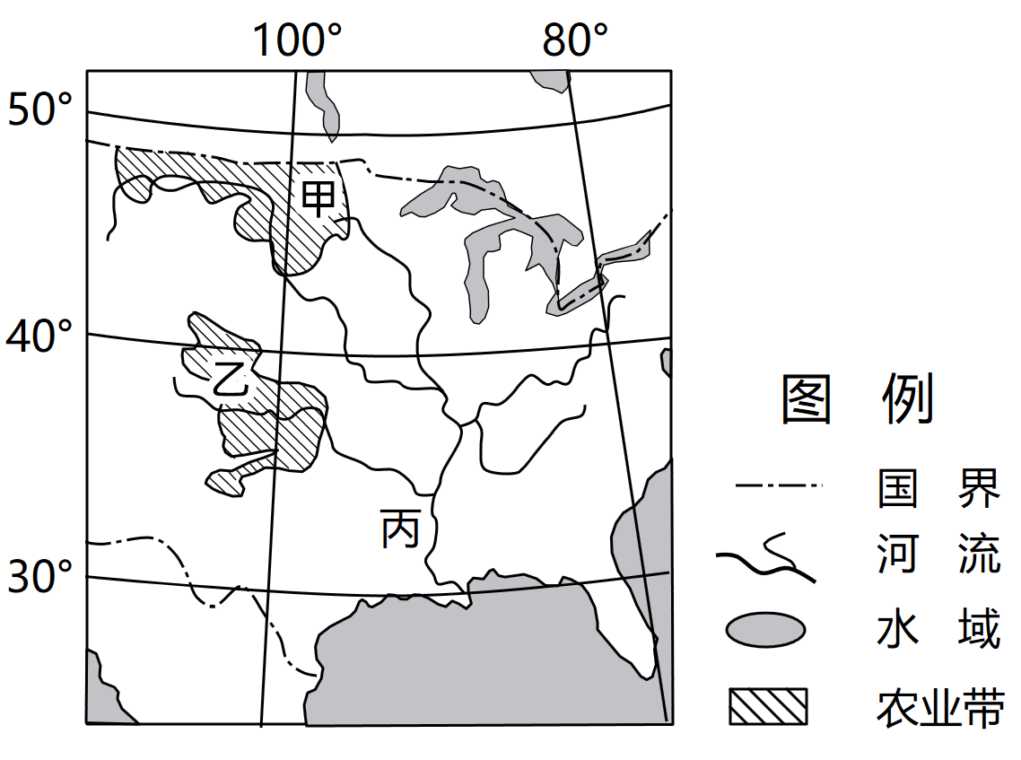 题目5:观察图中信息可知,甲和乙农业带属于美国的小麦农业带,由于甲农业带纬度较高,冬季气温较低,小麦难以越冬,因此种植的是春小麦,由于春季回暖,气温较高,小麦生长周期较短,故A正确;甲带只有一条密西西比河的支流灌溉,属于内陆地区降水量较少,不适合发展水稻生产,故B错误;乙带属于冬小麦带,由于纬度较低,气温较高,冬季小麦可以越冬,但是种植小麦时间是秋末冬初,而不是冬季播种,故C错误;乙带属于美国的小麦带,有河流灌溉,草原主要分布在西部地区,且美国乳畜业主要在东北部五大淡水湖周围,故D错误。答案选择A。