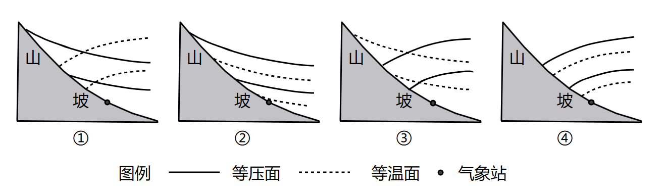 题目24:根据题意,白天山坡升温快,气流上升,气压较低,形成低压,表现为等压线下凹,排除A、B选项。根据温压原理:气温高,气压低,可知气压与气温呈负相关,即等压面下凹,等温面上凸,C正确,排除D选项。故选C。