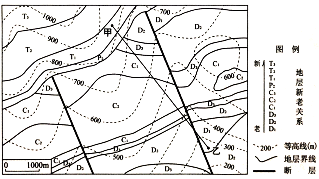 解析:观察图中信息,结合所学知识可知,等高线向高值凸出为山谷,向低值凸出为山脊,图中显示甲乙线从上山脊向山谷下落,再向山谷另一侧爬升一小点距离,结合图中地层新老关系老到新顺序为D1-D2-D3-C1-C2-C3,弯曲方向可知,地层向下弯曲,故排除②和④;图中显示新老关系可知,按照老到新顺序为D1-D2-D3-C1-C2-C3,岩层越老,越在下面,按照图中甲乙走向,山脊下山谷距离较长(也就是甲下坡线地层较长),且T1、P2与D2、D3、C1交错,可判断①正确;图中显示T1、P2与D2、D3、C1交错不平行,但③显示大致平行,故③错误。答案选择A。