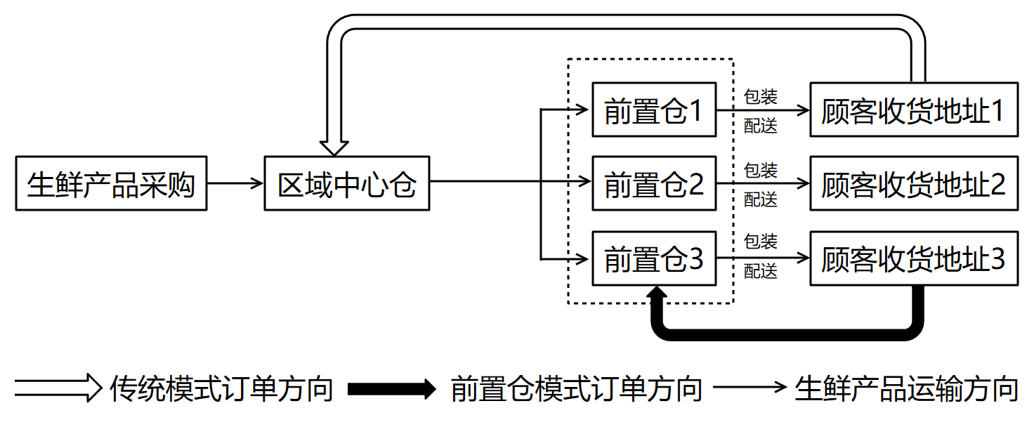 前置仓是生鲜企业在区域中心仓的基础上设置的小型仓库,以辅助产品配送。下图是我国某生鲜电商企业运营模式图,顾客通过手机APP发送订单信息。虚线部分为新增的配送环节。完成下面小题。