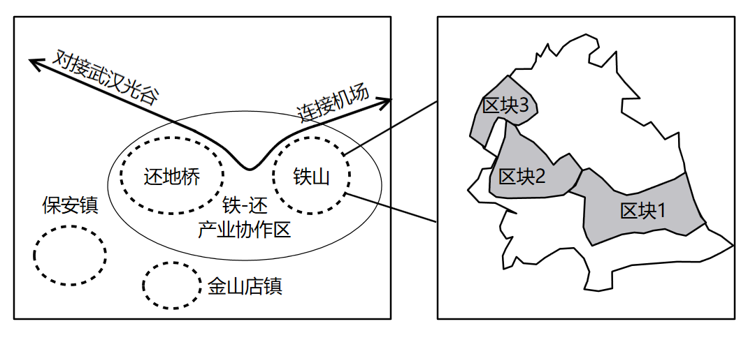 湖北省工业小镇数量较多,以规模较小的工业企业为主,依托农业发展的食品加工类特色农产品小镇占主体地位。位于黄石市西部的铁山区(下图)属于武汉城市圈,在黄石和武汉1小时交通圈的距离以内。铁山区工业小镇分为三个区块建设,共同构成较为完整的生产、生活、服务及智能创新链条。铁山区工业小镇以启动阶段的一个工模具企业为特色产业的龙头企业,带动一系列工模具企业的发展。