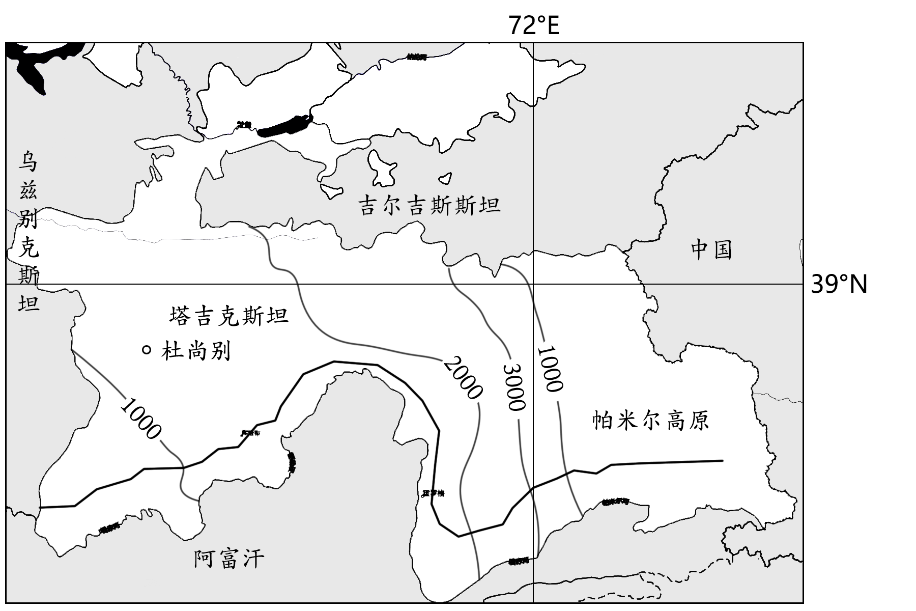 解题思路:结合图中纬度信息以及等高线信息可知,帕米尔高原位于该国的东部,海拔高,区域地处中纬西风带,西风从大西洋带来一定水汽,遇到山地阻挡抬升,形成地形雨。同时,帕米尔高原海拔高,存在冰川分布,水资源相对较为丰富。结合图中河流信息可知,主要大河发源于帕米尔高原,受高山冰雪融水和部分山地降水的补给,径流量相对较大,塔吉克斯坦主要位于这些大河的上游地区,水资源相对丰富。根据材料信息可知,塔吉克斯坦耕地总面积小,且复种指数低,该国大面积种植棉花会压缩该国其他农作物的种植面积,从而使得其该国其他农作物的产量较小,尤其粮食作物的产量较小,从而增加了该国粮食的对外依赖度,影响国家粮食安全。区域深居内陆,远离海洋,整体而言,水资源并不十分丰富,而棉花的耗水量较大,大面积种植棉花可能导致该国的水资源短缺,影响水资源安全。区域气候干旱,降水整体偏少,大面积种植棉花会开垦新的耕地,导致草地资源破坏,种植过程中不合理灌溉也会导致土壤次生盐渍化、土壤沙化等问题,从而引发土地资源安全问题。