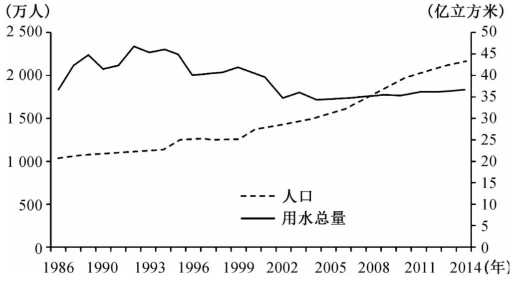 我国某直辖市面临着严峻的水资源压力,随着对水资源的管理加强和各种措施的实施,用水压力有所缓解。下图示意1986~2014 年该直辖市人口及用水总量变化。据此完成3~4题。