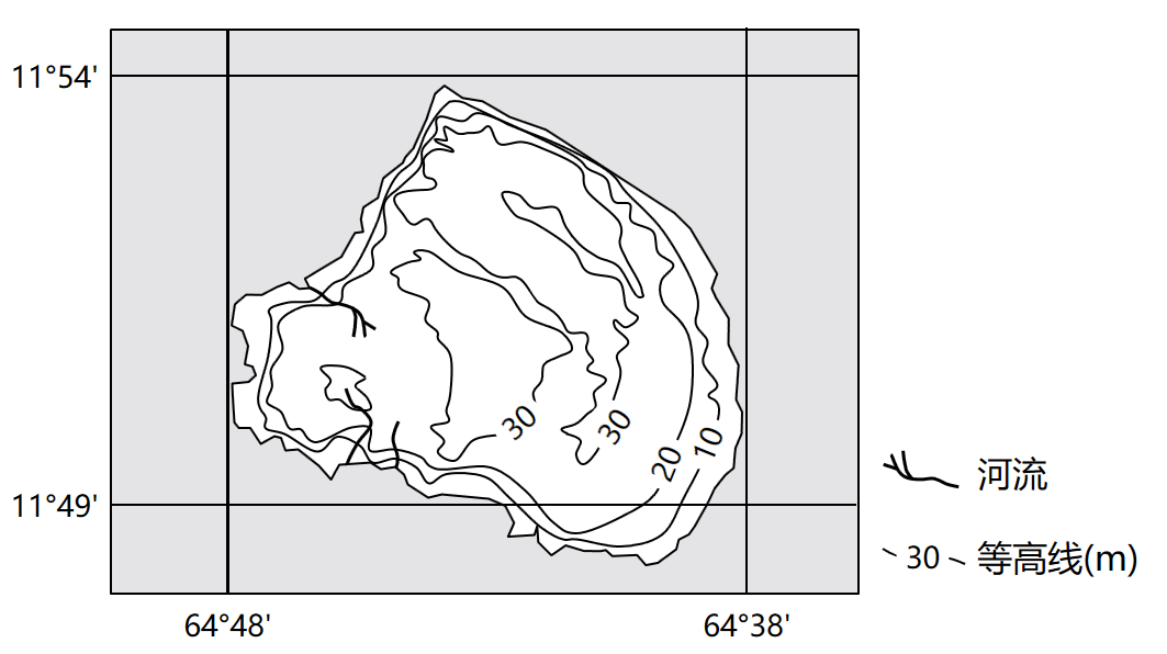 某珊瑚岛位于加勒比海,面积约65平方千米,有着清澈的海水、温柔的海风和白色的沙滩,岛上植被稀疏,除了渔民和偶尔出现的旅游者,几乎没有人会在岛上逗留。图1示意该岛等高线分布。据此完成4~5题。
