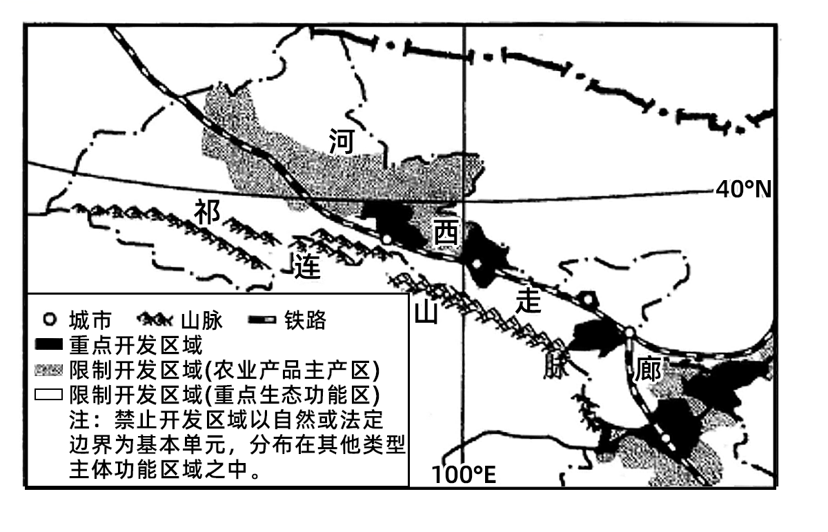 祁连山脉位于中国青海省东北部与甘肃省西部的交界处,由多条西北一东南走向的平行山脉组成。海拔4000米以上的多座山峰终年积雪,形成西北地区的“湿岛”。河西走廊是我国古今交通和经济发展的大动脉。依据土地适宜开发的程度、自然资源的丰富度、生态环境的脆弱度和经济发展水平等地理背景,将河西走廊建设的主体功能区规划为重点开发区域、限制开发区域(限制的是大规模工业化、城镇化开发)和禁止开发区域。下图示意河西走廊主体功能区规划。