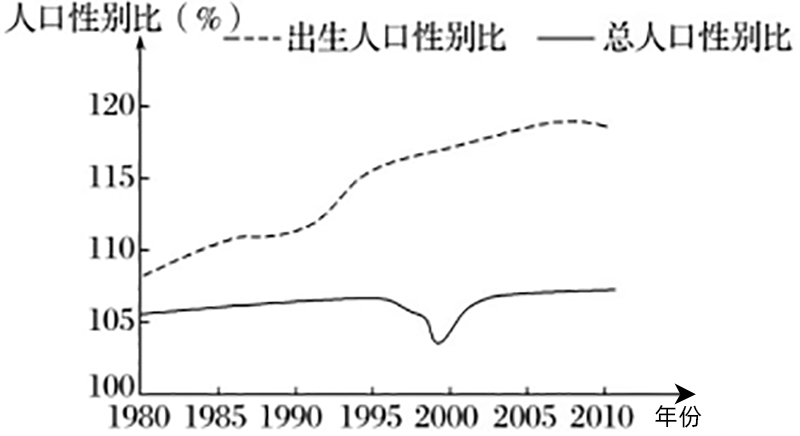 性别比是指人口中男性人口与女性人口的比值(通常指100 个女性对应的男性人口数)。下图为我国近 30年来出生人口(活产婴儿)和总人口性别比的变化图。据此完成3~4题。