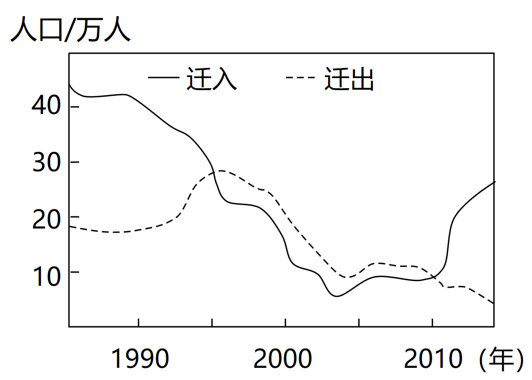 人口迁移率是一定时期、一定地区人口迁入、迁出的绝对量,与该时期、该地区平均人口数之比。读我国某地区迁移人口曲线图,完成11~12题。