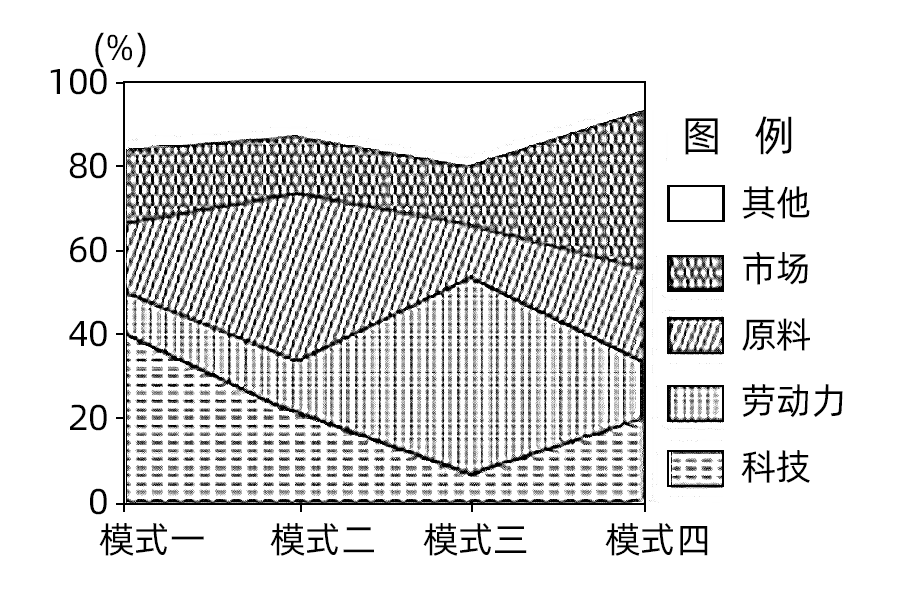 解析:读图判断出四种模式对应的工业指向类型,模式一科技导向型、模式二为原料导向型、模式三为劳动力导向型、模式四为市场导向型。