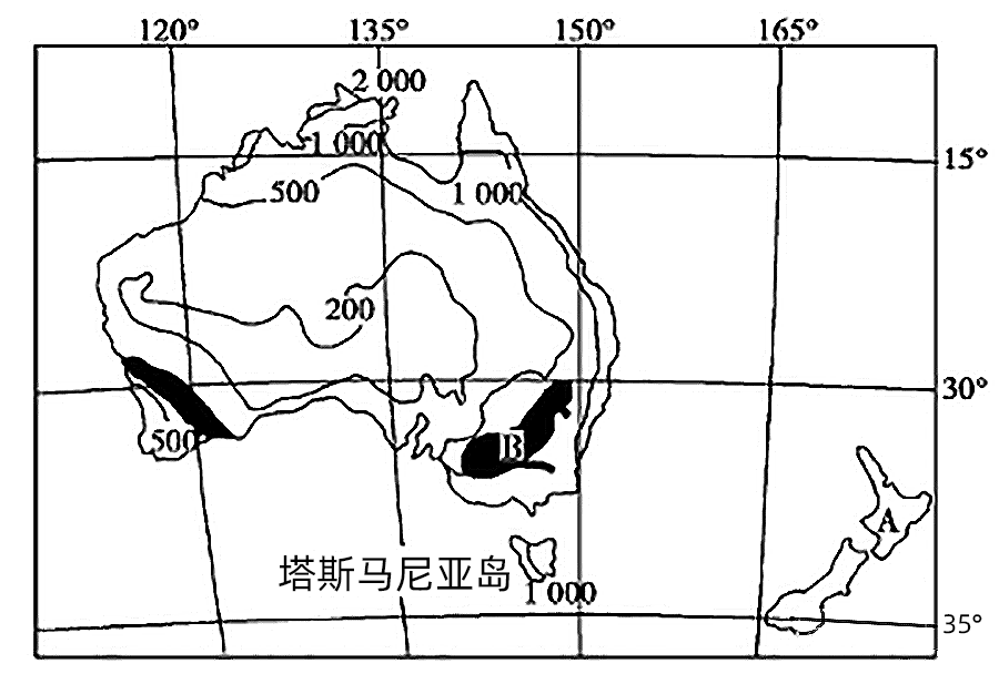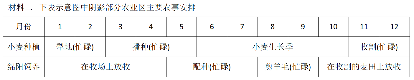 材料一:下图为世界某区域等降水量线分布图(单位: mm),阴影部分表述该国某种农业地域类型的主要分布区。