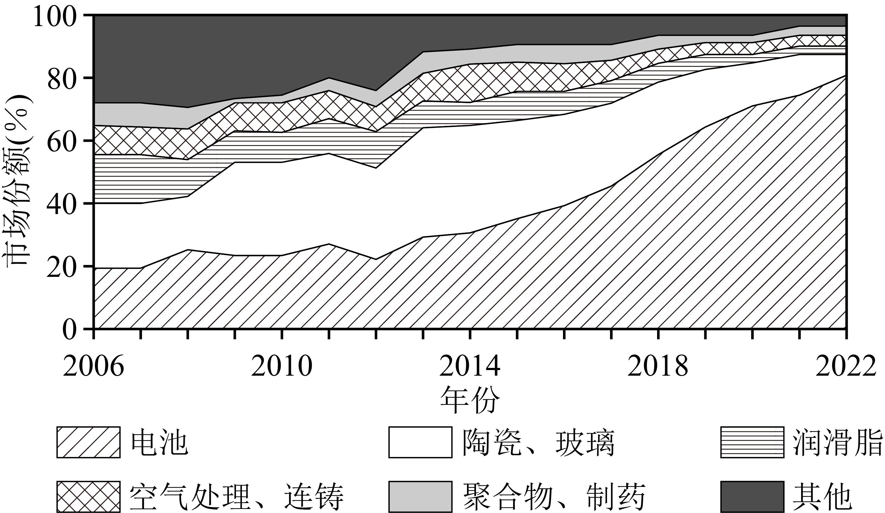 锂是我国战略性矿产资源,也是重要的能源金属。下图为2006~2022年全球锂应用行业市场份额图。完成下面小题。