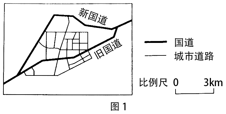 近十几年来,随着经济发展和家用汽车普及,我国区域公路干线(国道或省道)在经过平原地区县城时,一般经历从穿城到绕城的变化。图1示意经过某县城的国道布局变化,其中新国道建成通车后,旧国道转为城市道路。据此完成4~6题。