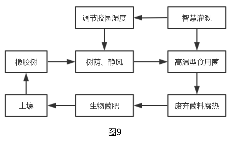 图9示意在橡胶林下种植高温型食用菌的生产模式,该模式具有较高的经济效益和生态效益。