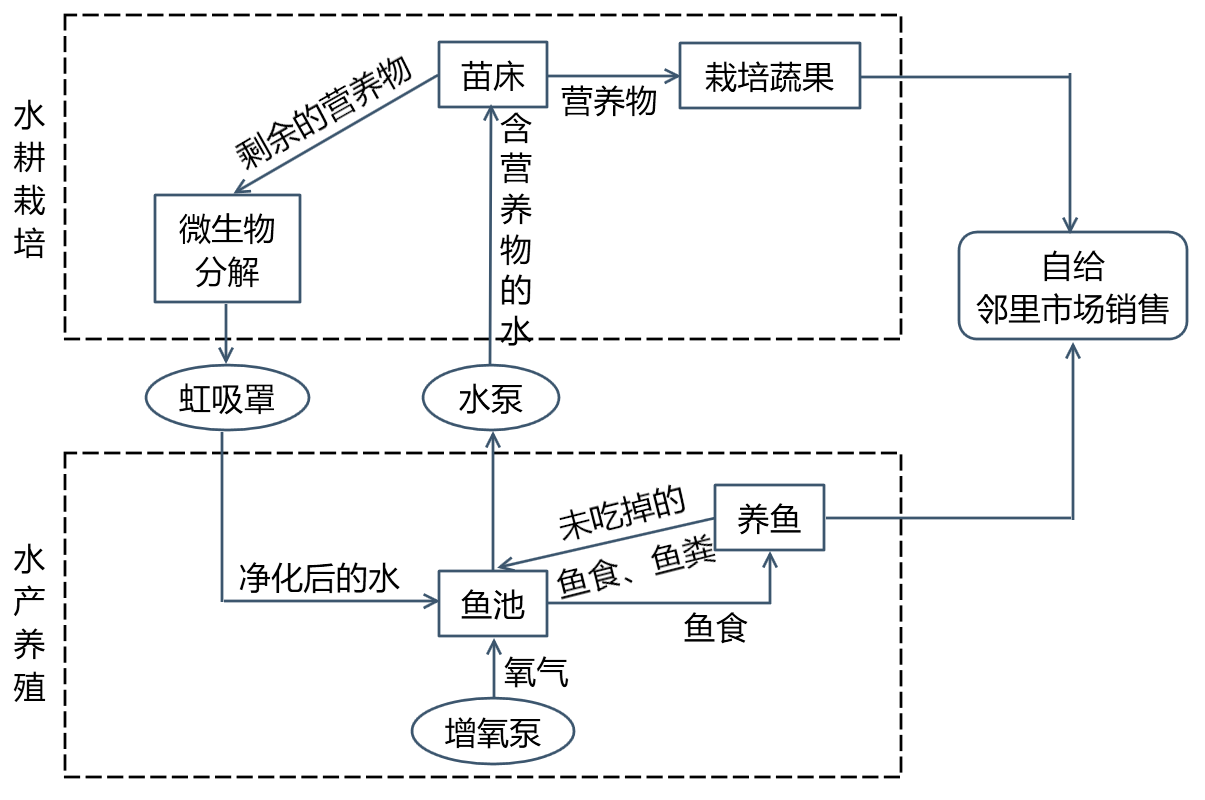 “养耕共生”模式是利用养耕共生系统技术建立起来的一种新型都市农业生产形式,用于城市屋顶、阳台、地面庭院等地方,产品自给或在邻里市场销售。以色列国土大部分是荒漠,水资源奇缺,城市人口比重大。近些年来,以色列在城市推广“养耕共生”模式,促进了绿色科技型都市农业的发展。图7示意养耕共生系统运作原理。