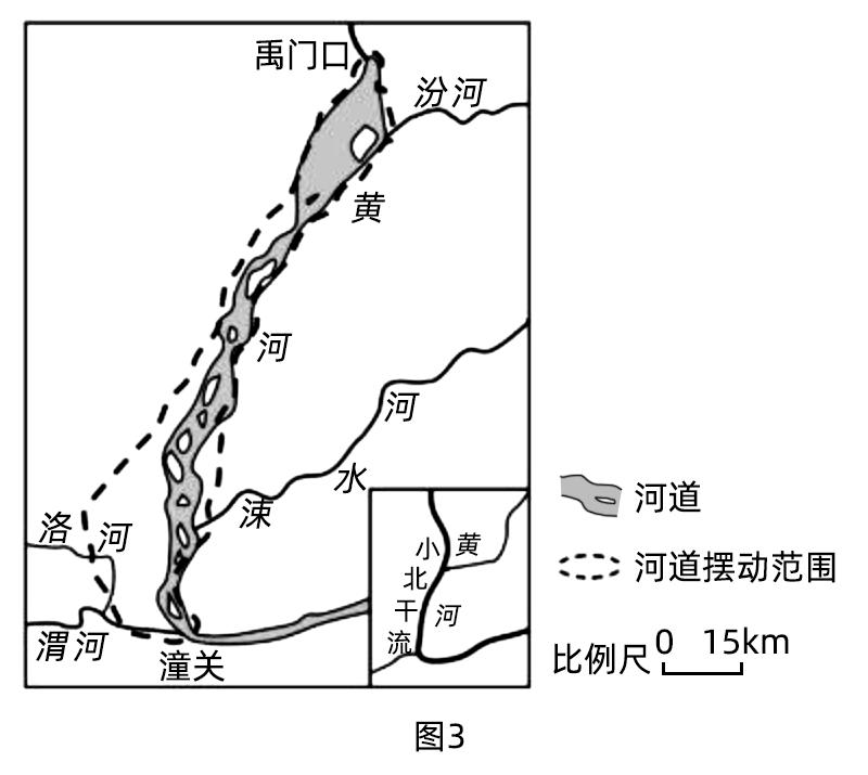 黄河小北干流是指黄河禹门口至潼关河段。全长132.5千米。该河段左岸有汾河、涑水河,右岸有渭河等支流汇入,河道摆动频繁,冲淤变化剧烈。为典型的堆积性游荡河道。图3为黄河小北干流河段示意图。据此完成9~11题。