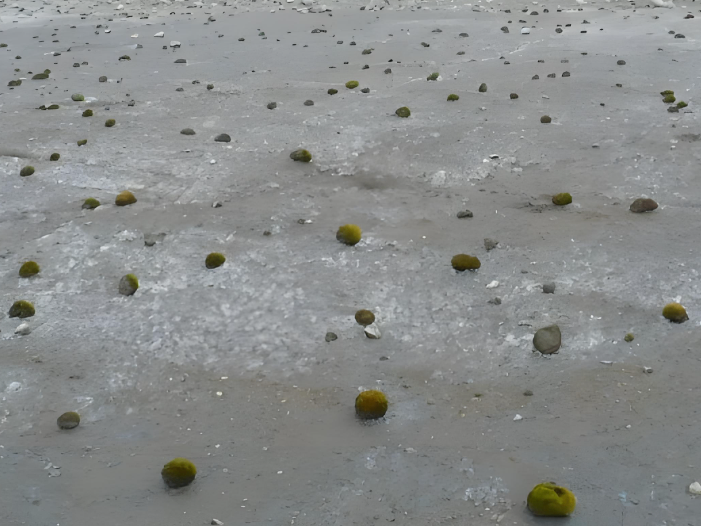 阿拉斯加某冰川前端(142.9°W,61.5°N附近)的冰面上,呈斑块状分布着少量的矿物质,并生长着一种苔藓球。这种苔藓球内部由生物体和有机残体交织,形成相对独立的生存环境。它们靠暖季在冰面上滚动方能维持生存,被形象地称为“冰川老鼠”。下图是冰面上的苔藓球照片。据此完成下面小题。