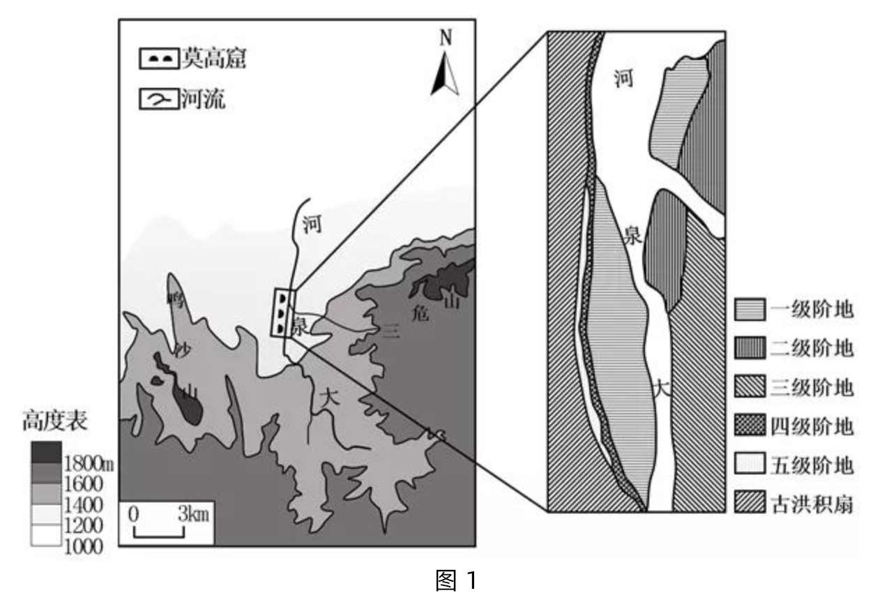敦煌莫高窟位于河西走廊西端,开凿在大泉河西岸第四级阶地的砂砾岩崖壁上(图 1)。崖壁最高达50m,洞窟主要分布在10~40m高度之间,一般为2~3层。由于洞窟开凿和长期自然作用的影响,洞窟所在崖体出现大量裂隙。据此完成下面小题。