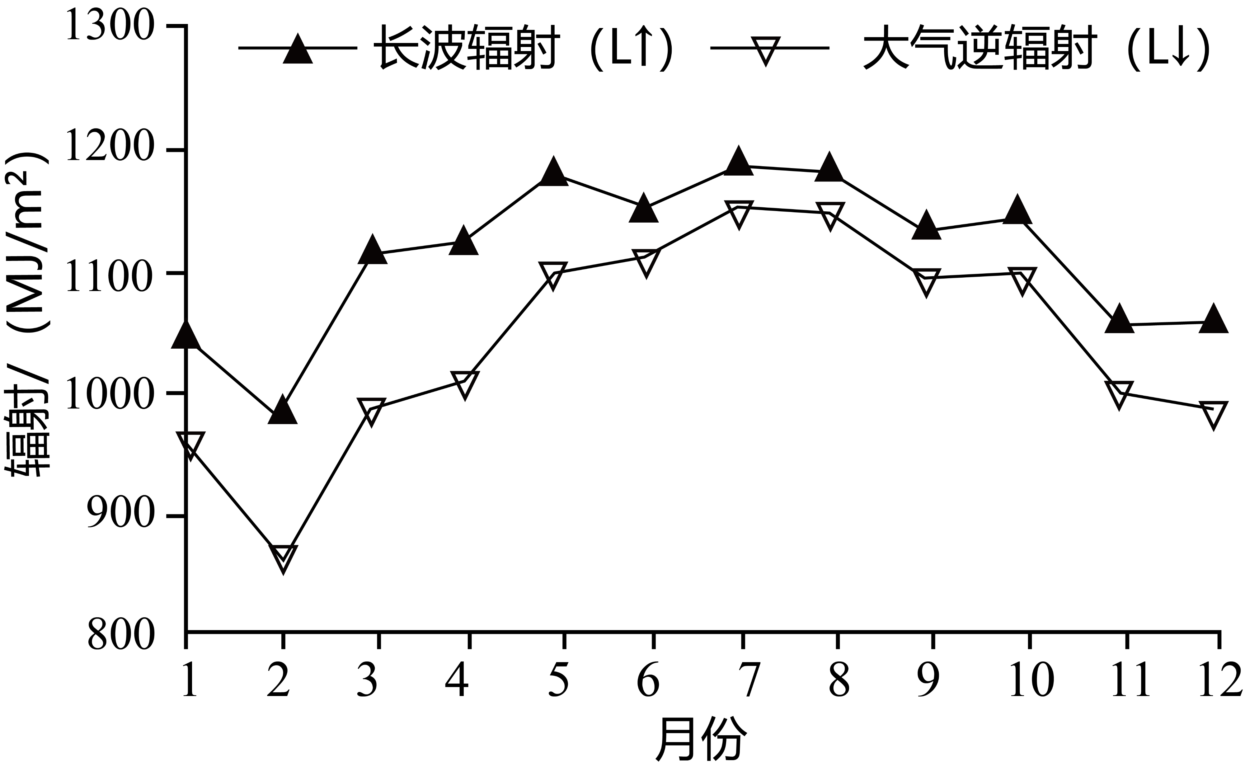 有效辐射为下垫面向上长波辐射与大气逆辐射的差值。如图表示2003—2012年云南省西双版纳热带季雨林林冠层向上长波辐射(L↑)及其上大气逆辐射(L↓)的月平均变化。据此完成下面小题。
