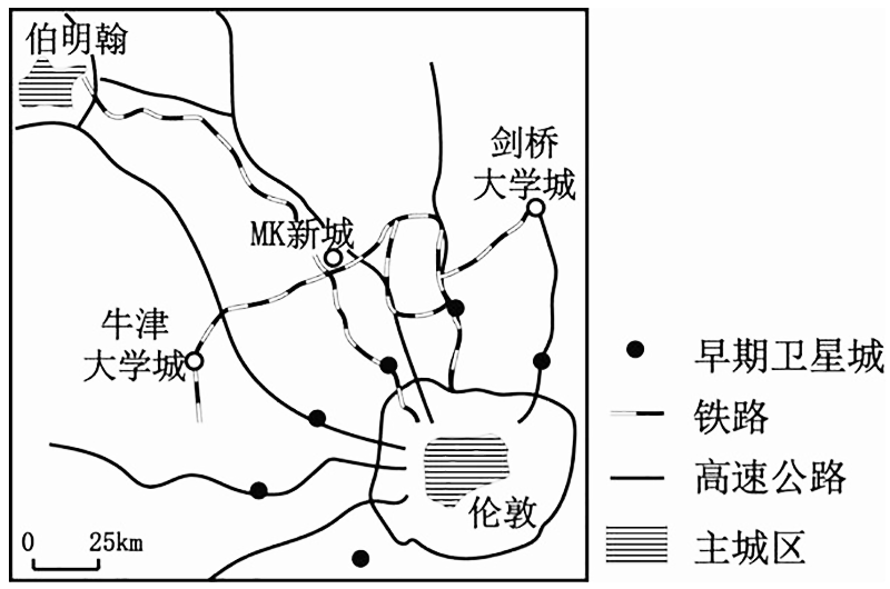 下图中,卫星城和新城的建设目的是疏解伦敦主城区人口。早期卫星城以工业为主且工厂相对集中,人口3~6万,道路呈环形放射状。MK新城建于1971年,以服务业为主,道路呈网格状。2014年起,MK新城依托周边地区资源,推进“智慧城市”建设,即时提供各类数据,促进通信、教育、社区和商贸等发展。2020年,MK新城人口约27万。据此完成6~8题。