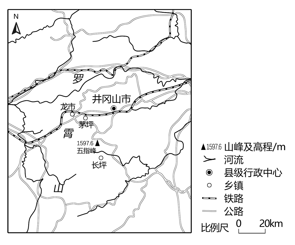 党的十八大以来,革命老区井冈山贯彻新发展理念,加强通信网络建设,推动经济质量发展。随着网络全覆盖,农民通过开网店,直播卖货,足不出户就可将农林土特产品迅速销往全国各地。图1示意井冈山地理概况。据此完成1~3题。