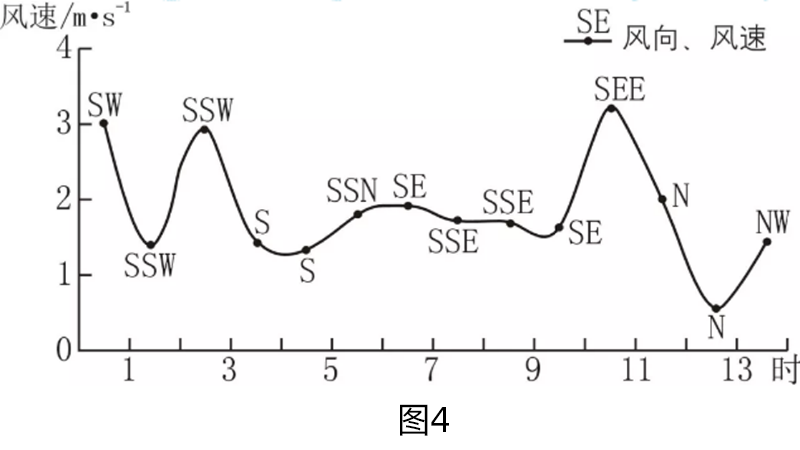 山谷风是山区昼夜间风向发生反向转变的风系。白天太阳辐射导致山坡上的空气增温强烈,暖空气沿坡面上升,形成谷风;反之,则形成山风。祁连气象站位于祁连山中段的山谷中,山谷风环流较为强盛。图4示意2006年8月24日该气象站记录的山谷风风向、风速的变化。据此完成19~20题。