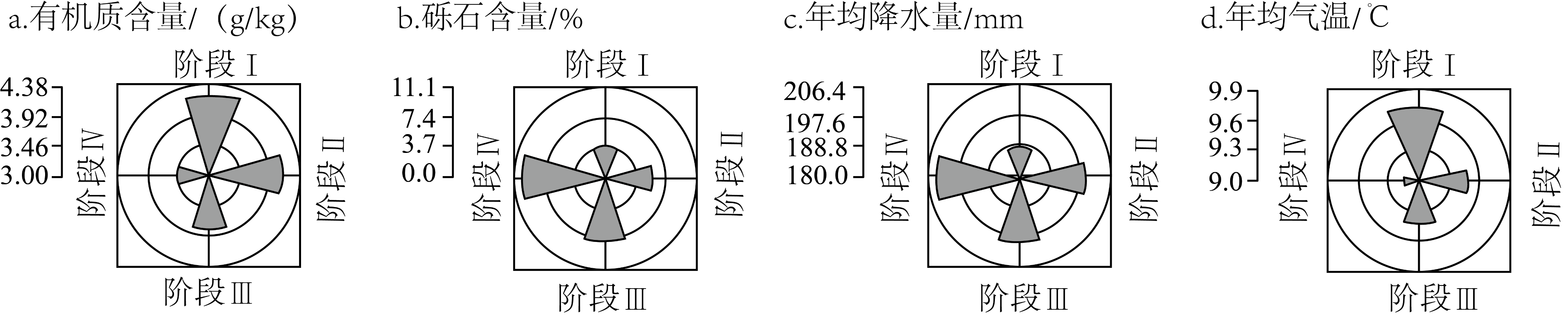 1984年以来,贺兰山东麓地区葡萄酒产业发展经历了萌发停滞(Ⅰ)、缓慢发展(Ⅱ)、快速发展(Ⅲ)和高速发展(Ⅳ)4个阶段,葡萄种植面积持续增加,葡萄酒生产集群规模不断扩大且重心向东南方向移动。如图反映4个阶段葡萄种植区自然要素变化。据此完成下面小题。