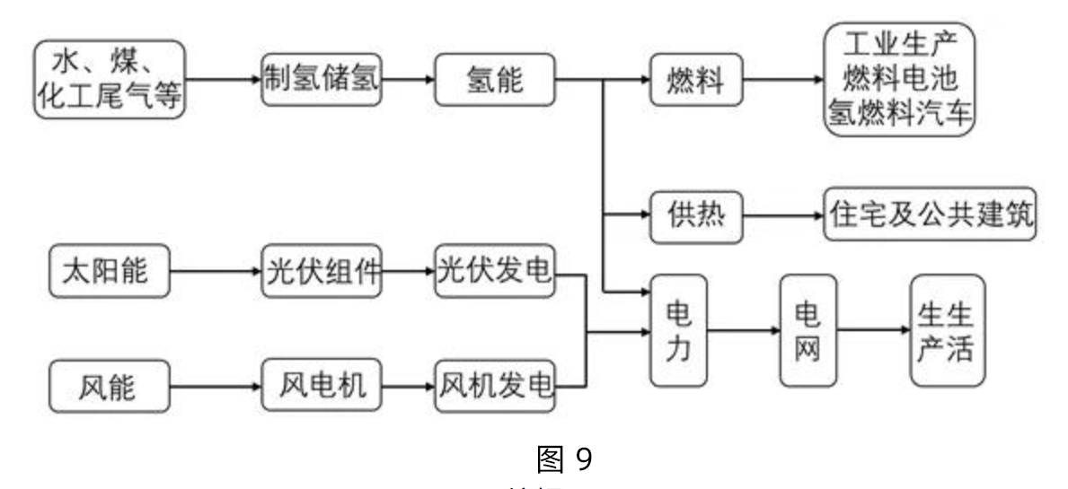 山西省大同市是中国大型煤炭能源基地之一,素有“煤都”之称。近年来,大同市多措并举,实现了从“煤都黑”到“大同蓝”的转型。在此过程中,大同市大力发展新能源,把太阳能、风能、煤炭资源富集优势转化为绿色产业优势,打造“新能源产业之都”,并积极融入京津冀协同发展。自2017年以来,大同市相继建设能源改革科技创新产业图和新能源产业城,培育和发展氢能与燃料电池先导、储能蓄能、新能源汽车装备制造、光伏全产业链和煤炭清洁高效利用五大产业集群。图9示意大同市新能源产业链。