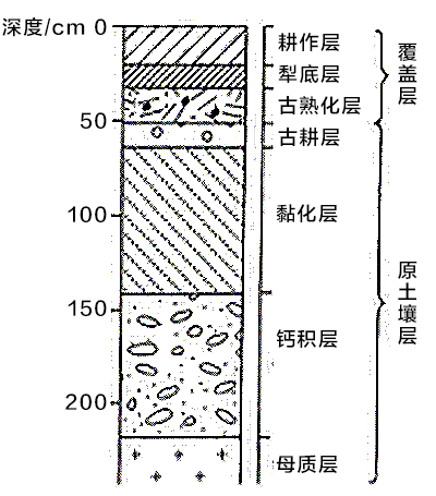塿土主要分布于陕西关中盆地,是自然土壤在数千年耕作过程中经粪土堆垫改良形成的人为土。在剖面上覆盖层与原土壤层叠置,形似“楼层”(如图)。其中,黏化层质地黏重、呈褐色或红褐色。据此完成下面小题。