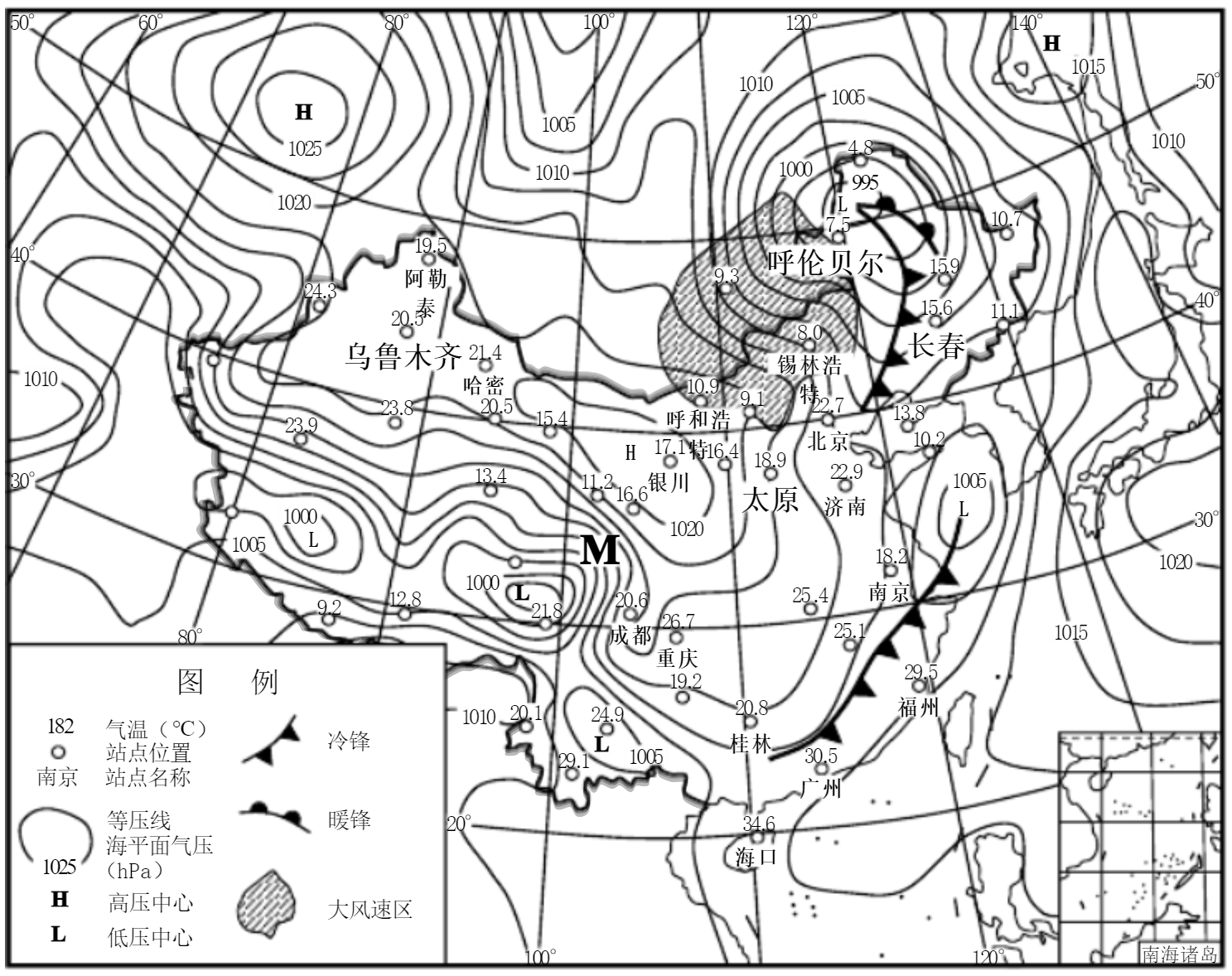 图为某日14时亚洲部分地区地面天气简图,据此完成下题: