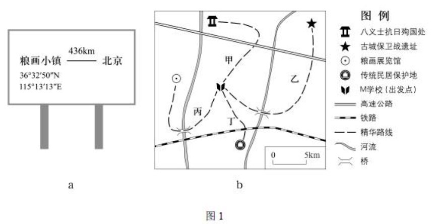 我国某镇利用当地主产的粮食制作粮画,打造粮画小镇。图1中a是M学校设计的小镇地理位置指示牌,图1b是该校设计的四条“行走的思政课”精华路线示意图。读图,回答第1、2题。
