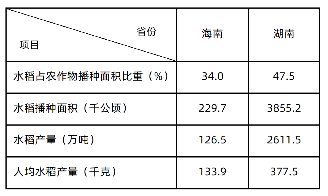 海南省是我国栽培水稻起源地之一,自然条件优越。“杂交水稻之父”袁隆平院士科研团队在海南省三亚市建有水稻育种试验基地,在此选育了多个高产杂交水稻品种。一直以来,海南省稻作以“一年一熟”为主,“一年二熟”“一年三熟”仅分布在水源充足地区且总画积不大。海南省目前稻米缺口仍然较大。表2为海南省和湖南省2019年水稻生产的相关数据。