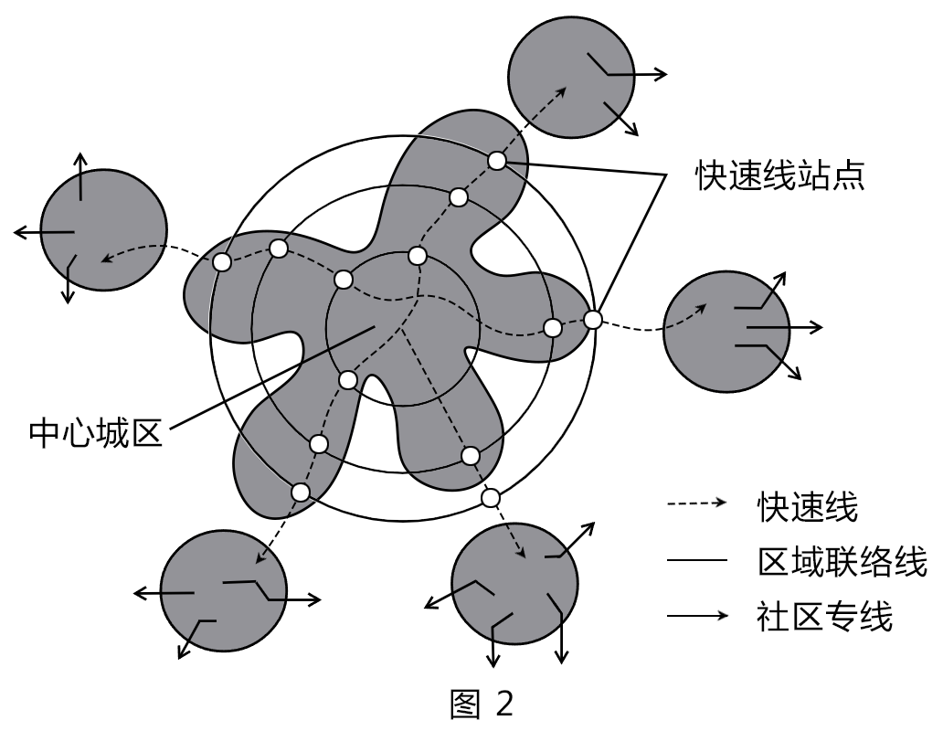 库里蒂巴是巴西东南沿海城市。自20世纪60年代,为解决城市快速发展中存在的一系列问题,该城市编制了以公交为主导的交通规划和城市规划并得以实施。经过多年建设,库里蒂巴形成了5条由市中心向外辐射的基于快速交通线的发展轴,同时有多种类型的公交线与快速交通线相连。沿快速交通线两侧进行高密度开发,发展轴间为绿地。快速交通线使用大容量低排放公交车辆。目前,库里蒂巴人均小汽车拥有量位居巴西前列,但公交出行率远高于其他城市。库里蒂巴将工业区布局在郊外快速交通线附近,发展低污染工业。图2为库里蒂巴公交网络模式图。