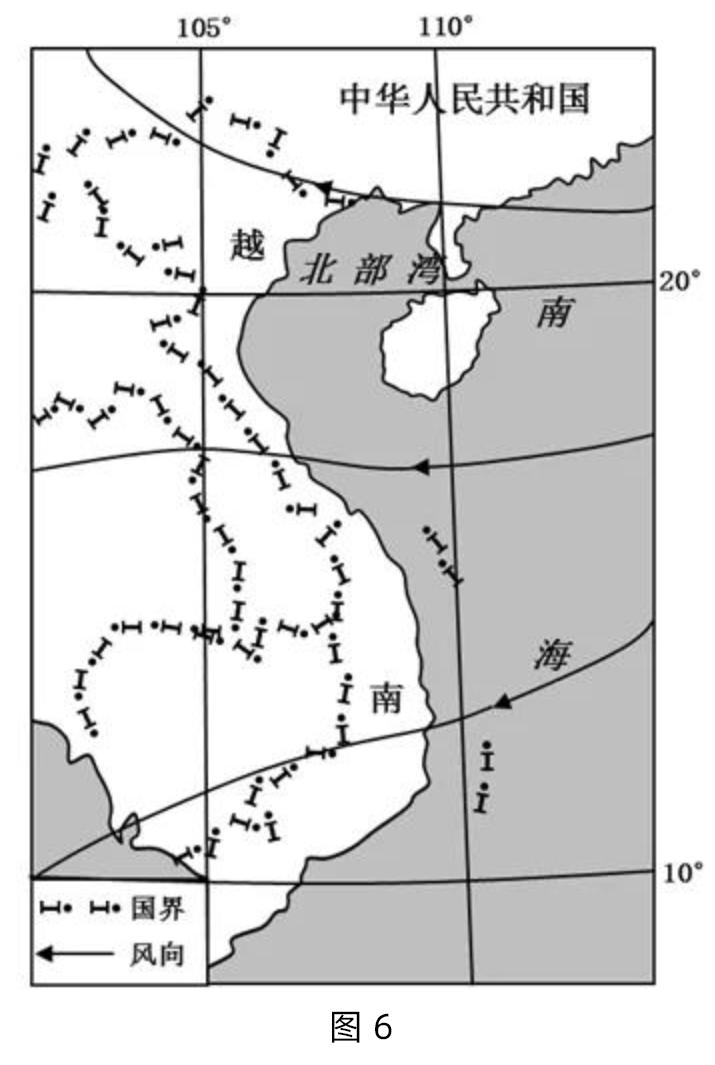 “克拉香天气”出现在越南沿海地区,是一种持续时间较长的雾天伴随濛濛细雨的天气,这种天气在越南北部沿海比南部沿海出现的几率更大。图6示意克拉香天气出现时段的风向。据此完成14~15题。