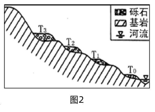 图2示意某条河流上游河段的单侧断面。该河流两岸依次分布着海拔不同的四个平坦面T0、T1、T2、T3,平坦面上均堆积着河流沉积砾石。砾石的平均粒径T3>T0>T2>T1。洪水期河水仅能淹没T0。据此完成6—8题。
