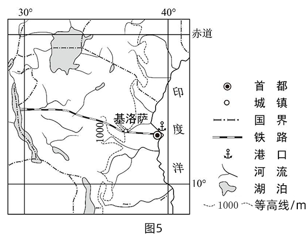 剑麻是一种热带经济作物,剑麻纤维韧性强,耐海水腐蚀,是制作船用缆绳、汽车内衬、光缆衬料等的上乘材料。非洲坦桑尼亚曾是世界最重要的剑麻生产国,被称为“剑麻王国”。自1999年,中国某公司在坦桑尼亚的基洛萨(位置见图5)附近投资兴建剑麻农场,并建设配套加工厂,所产剑麻纤维主要销往我国。该农场一期种植1000多公顷,雇佣当地长期和临时工超过1000人,预计2020年种植面积达3000公顷,年产剑麻纤维1万吨。该公司还帮助当地修建学校、卫生所等。