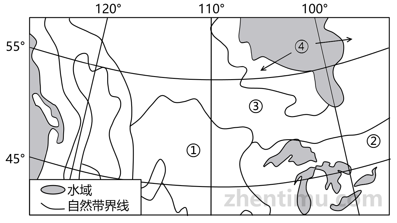 下图为北美洲局部地区陆地自然带分布图。完成11、12题。