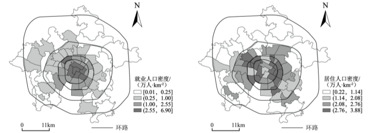 下图为某都市主城区就业人口密度与居住人口密度分意图。完成下面小题。