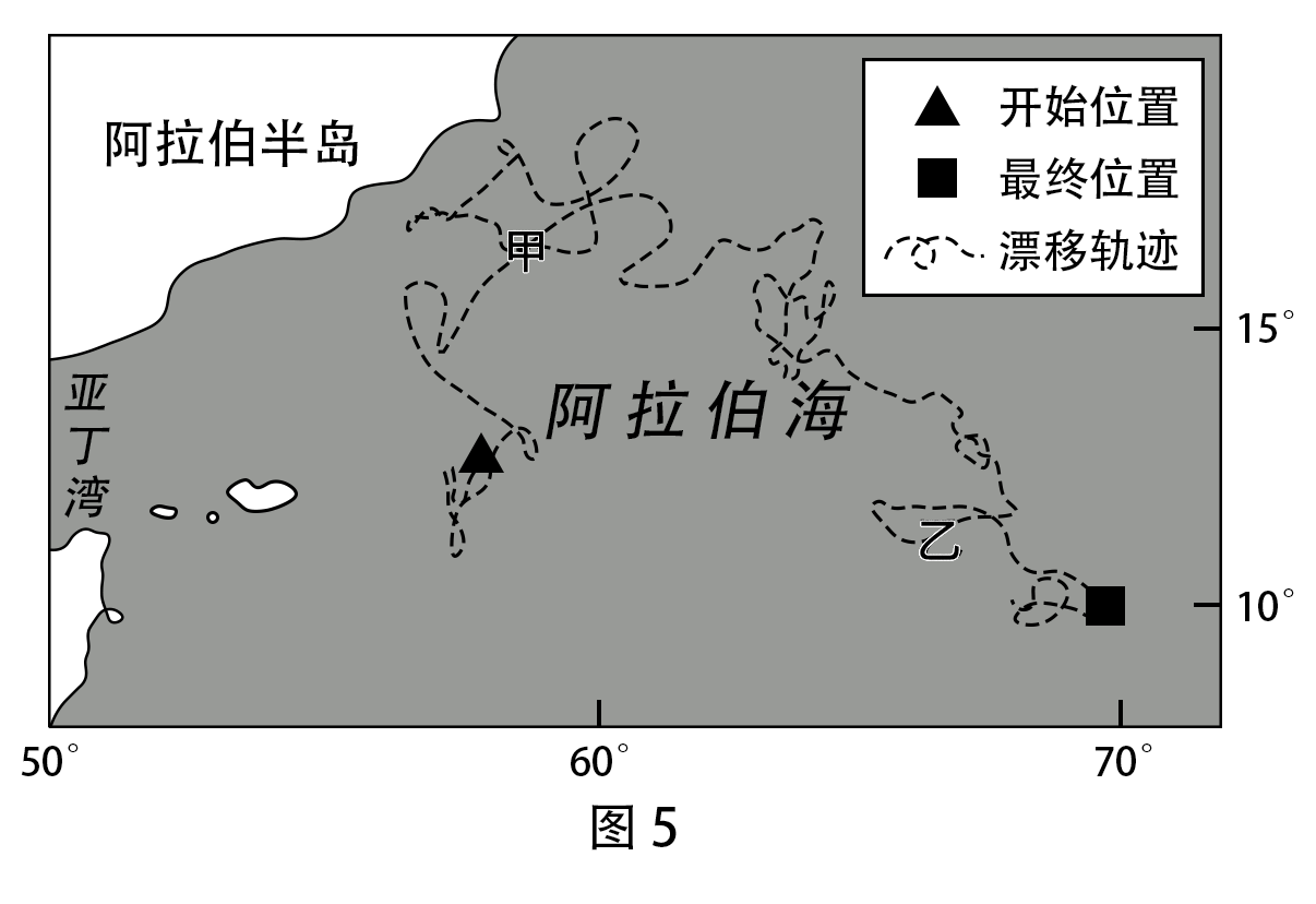 某全球海洋观测网在全球海洋投放数千个检测浮标,获取了全球海洋不同深度的温度、盐度、溶解氧、叶绿素等海量数据。我国于 21 世纪初加入该观测网。图五为我国在阿拉伯海投放的某个浮标 2011 年 11 月至 2016 年 6 月持续飘逸轨迹示意,图 6 为该浮标获取的不同深度海水逐旬平均温度。据此完成 12~14 题。