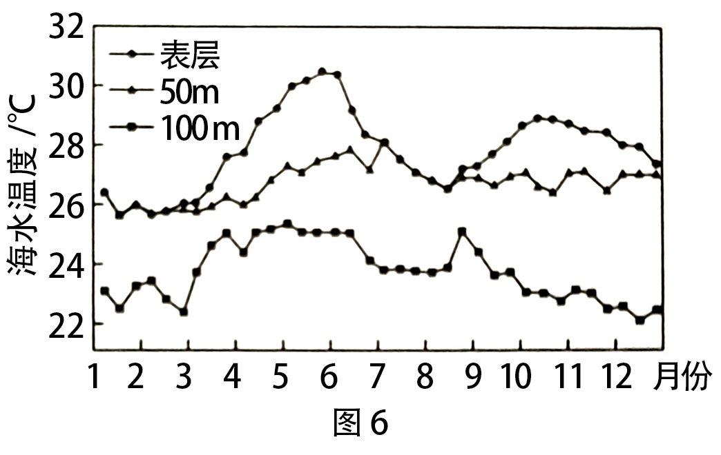 图 6 中 7-8 月份表层与 50m 深度海水温度相近,主要是因为