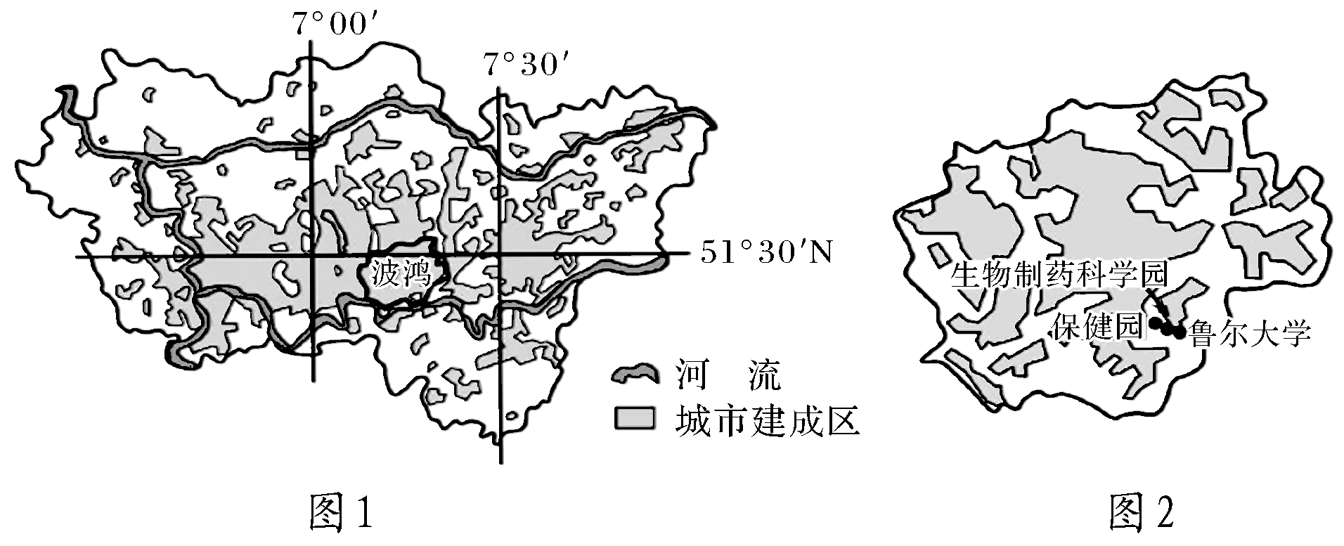 德国鲁尔区曾是以煤炭、钢铁产业为主的传统工业区,经过综合整治,经济由衰落走向繁荣,环境污染严重的局面得到根本改善。目前,该区有500多万人口,50多座城市,老龄人口比重高居德国之首。该区医疗保健业发达,拥有100多家医院、近万名医生及数以千计的保健站、药店等。波鸿市人口近40万,是重要的生物制药基地,多所大学的医学研究处于世界领先水平。2009年,鲁尔区医疗保健中心落户波鸿市,并新建保健园。图甲示意鲁尔区的城市建成区和波鸿市的位置,图乙示意鲁尔大学、生物制药科学园和保健园在波鸿市的位置。