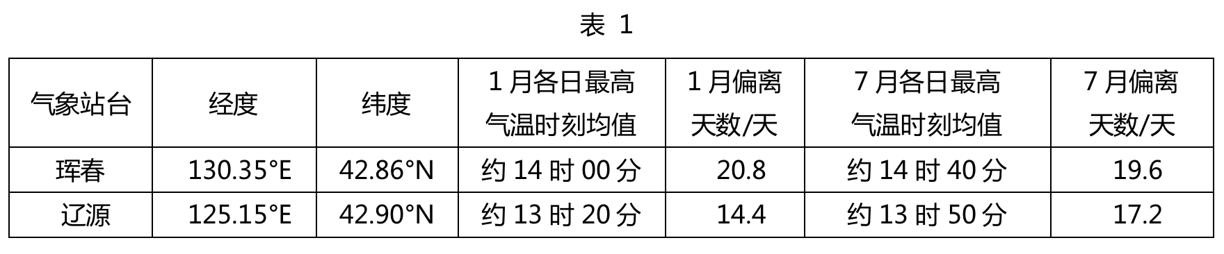 位于日本海附近的珲春与内陆的辽源各日最高气温时刻(北京时间)的月均值不同(表 1)。规定各日最高气温时刻与月均值相差超过1小时为偏离。据此完成 9~11题。