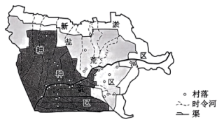 黄河三角洲村落空间形态具有明显的水适应性特征。在“河、塘、田、路、居”五因子的数量、分布等长期影响下,黄河三角洲的村落表现出团状、带状、指状3种典型空间形态。图1为黄河三角洲典型村落分布图。图2示意黄河三角洲村落空间形态。据此完成下面小题。