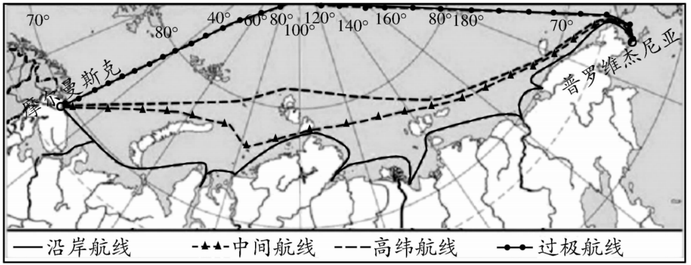 北极航道是连接大西洋和太平洋的海上捷径。随着全球气候变暖,北极冰区逐渐缩小,北极航道的商业价值越来越得到人们的关注。自2013年“永盛”轮首航北极东北航道以来,中国货轮已经多次航行在这条航线上。北极东北航道包含四条航线(下图),大体线路均西起摩尔曼斯克,东至白令海。据此完成8-9题。