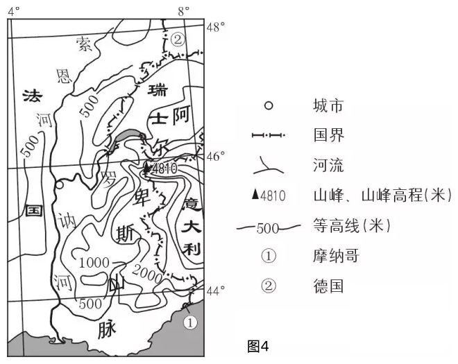 罗讷河发源于瑞士境内的冰川,在发过境内的流域面积占总面积的94%,历史上曾是一条“野性”河流,经常洪水泛滥。19世纪以来,法国对罗讷河进行多次整治,并于1931年成立“国立罗讷河公司”,作为罗讷河综合整治和开发的唯一授权机构。图4示意罗纳河流域的地形。