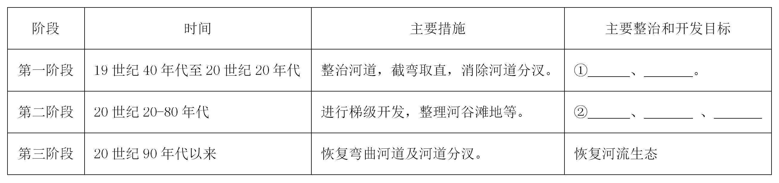 (2)表1列出罗讷河整治不同阶段的主要措施。请在下列整治和开发目标中进行选择,完成表1。请将选出的各整治和开发目标填写在答题卡的相应位置。(5分)