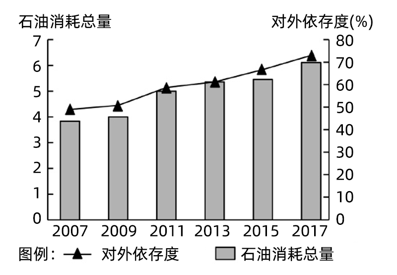 下图为我国2007~2017年石油消耗总量和对外依存度(石油净进口量/石油消耗总量×100%)统计图。完成下列小题。