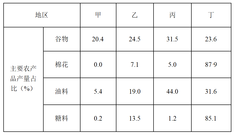 题目3:全国大致分成东部、中部、西部和东北四个经济地带;我国棉花的三个重要产地分别是西北内陆棉区、黄河流域棉区和长江流域棉区,主要集中在山东、安徽、河南、新疆等地,其中新疆是棉花最大的生产基地。我国东北地区纬度高,气温低,热量不足,不适合棉花种植。结合其它农产品在全国所占比重可判断:甲为东北地区、乙为东部地区、丙为中部地区、丁为西部地区。故选A。